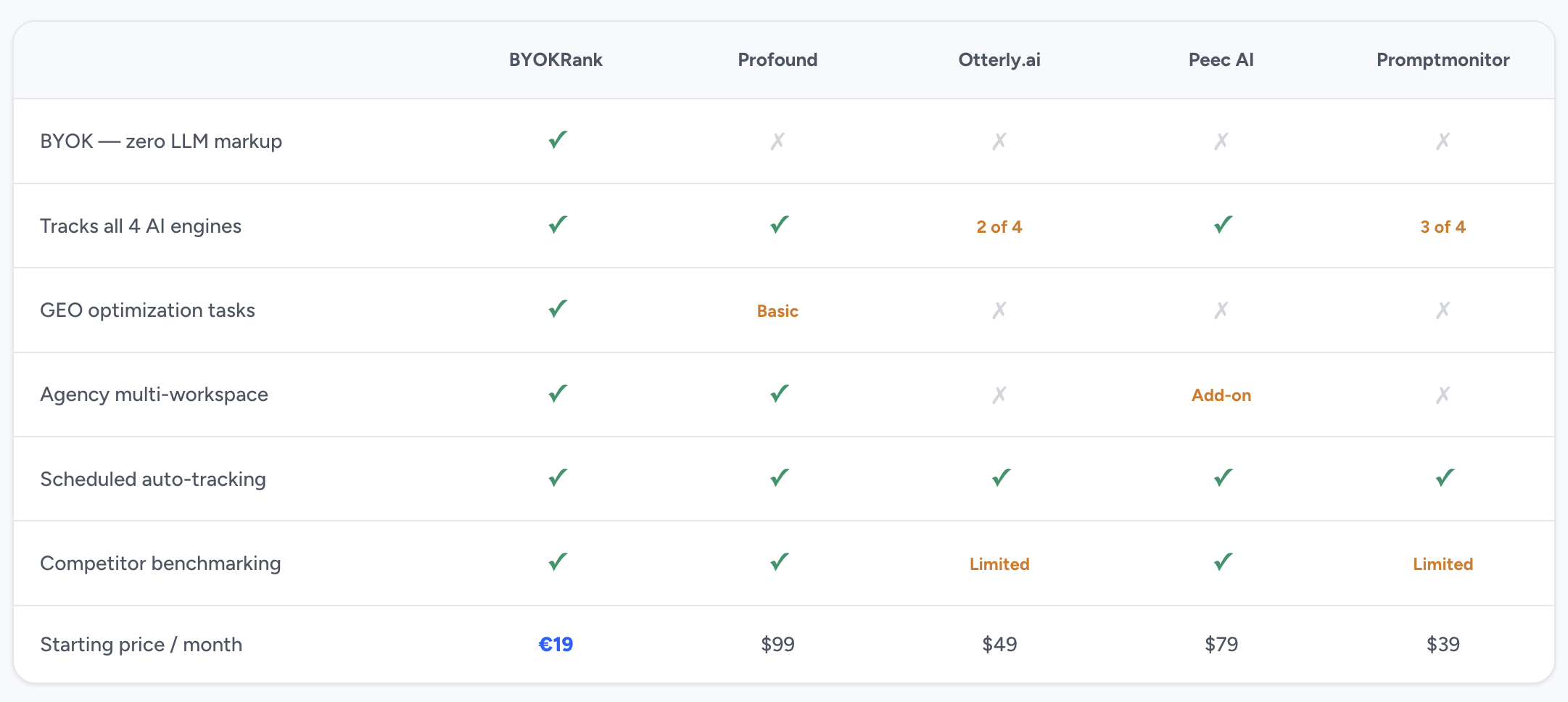 Most AI visibility tools charge you query-by-query through their own API markup. BYOKRank passes zero LLM cost to you — ever.
